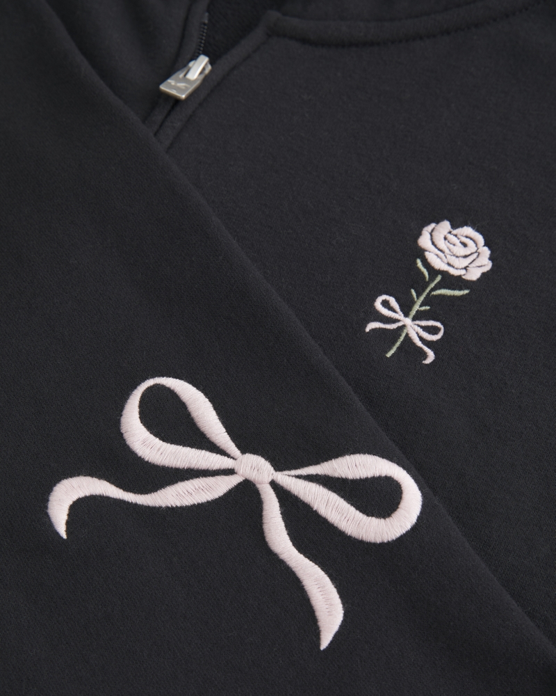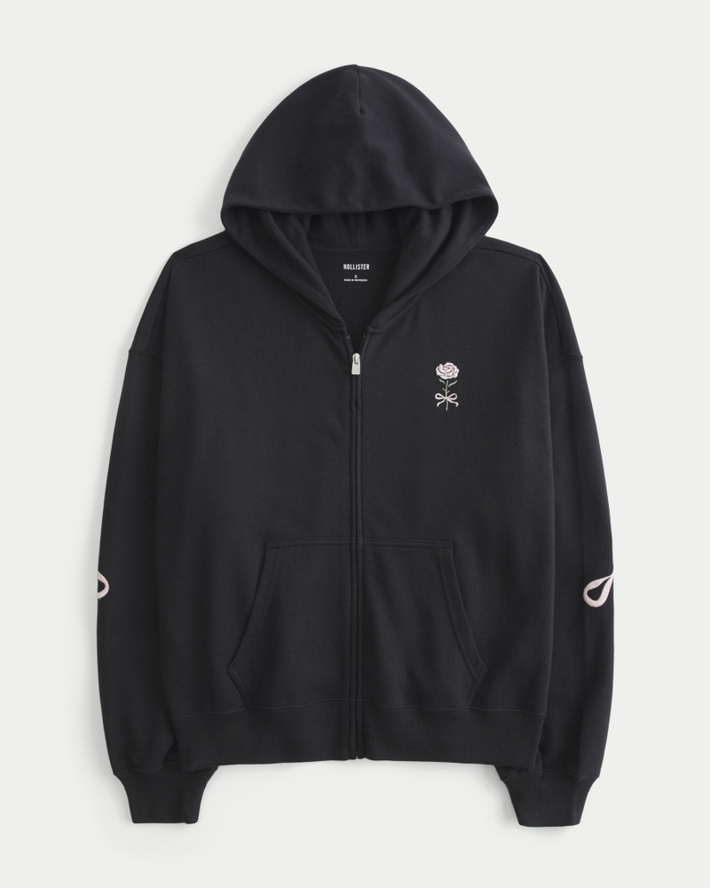 A super soft fleece hoodie with a full zip-up closure, front pockets and embroidered bow details at the left chest and sleeves. Hood, long sleeves. Oversized Fit. Imported.