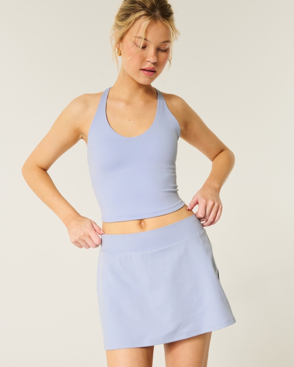This super comfy skortie is designed in our breathable, 4-way stretch, moisture-wicking Recharge fabric with a super soft, brushed feel. Cute a-line silhouette, built-in shorts with pocket, mid-rise waist. Imported.