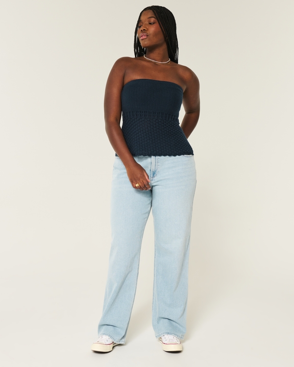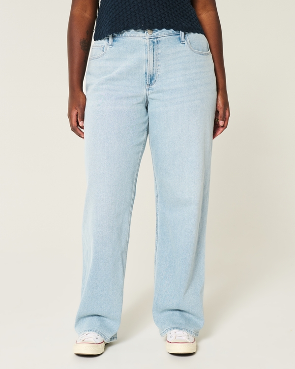 Comfortable denim jeans designed with a high-rise waist and relaxed leg. Vintage Stretch denim in a light wash with fading, whiskering and ripped details. Imported.