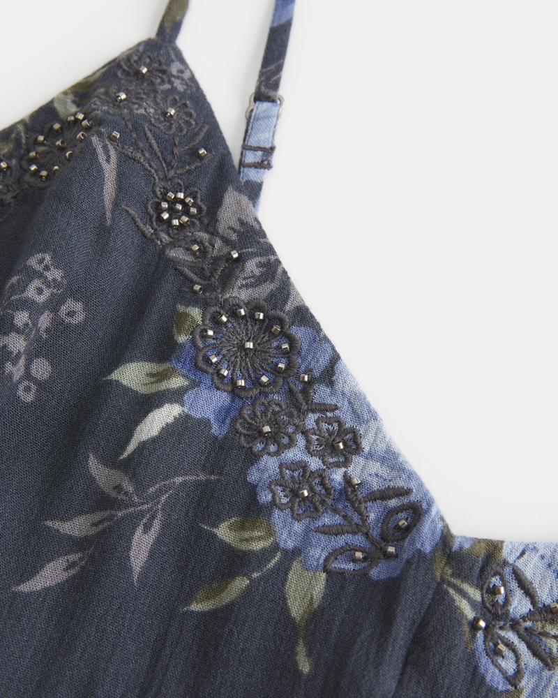 Flowy and super soft, this mini dress features a v-neckline with embroidery and bead details. Adjustable straps. Imported.