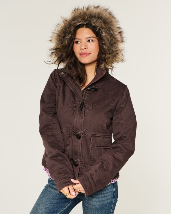 - Remove faux fur hood trim before wash
