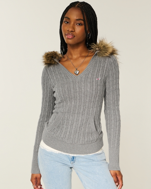 Faux Fur Trim Hooded Cable-Knit Sweater