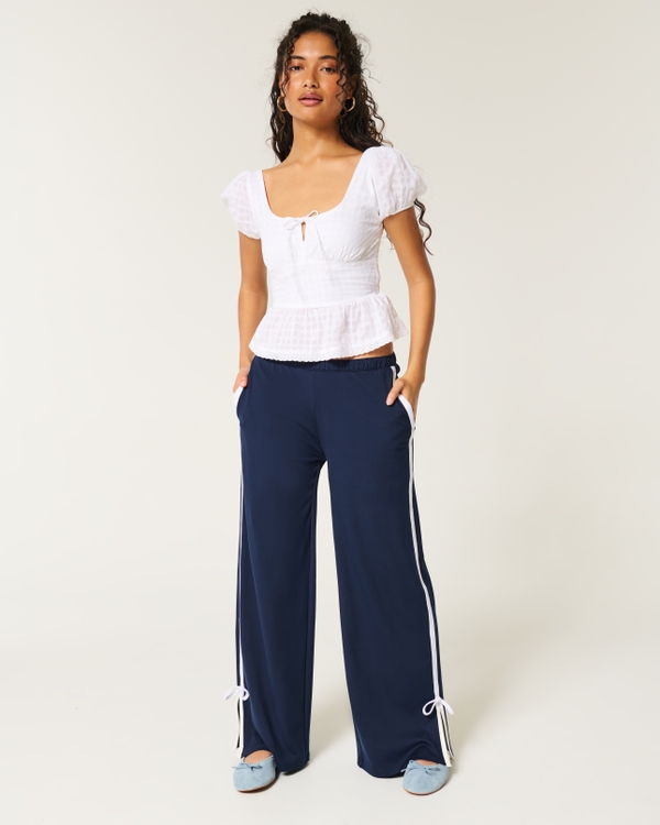 Designed in our breathable, 4-way stretch, moisture-wicking Recharge fabric with a super soft, brushed feel. These cute track pants feature tipped sides and tie details at the hems. Split side hem details, banded waist. Imported.