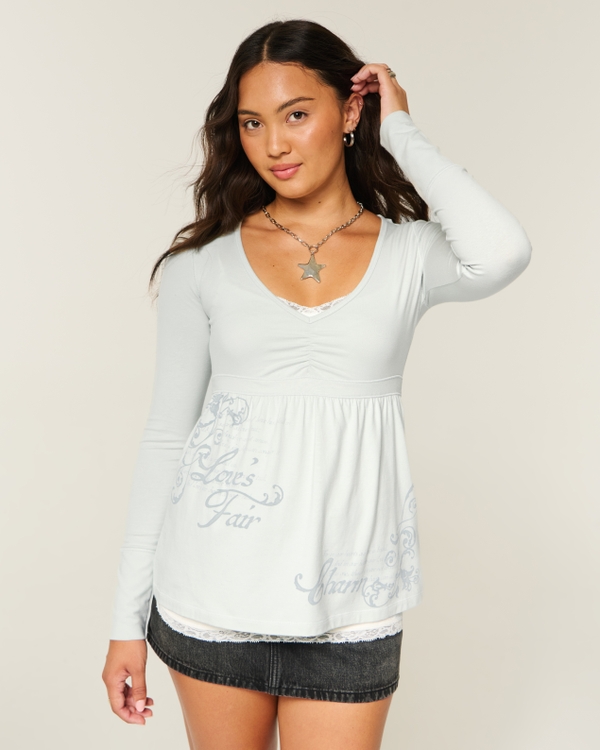Long-Sleeve Pinch Bust Graphic Babydoll Top