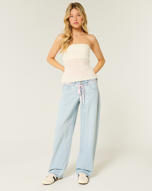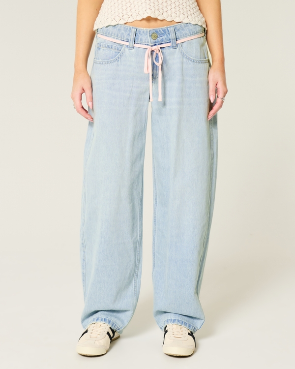 Low-Rise Light Wash Pink Shoelace Tapered Baggy Jeans