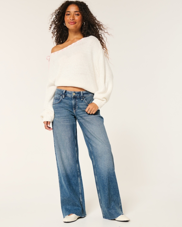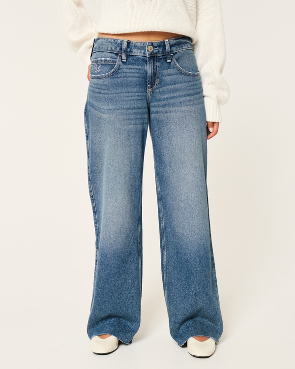 Low-Rise Medium Wash Embroidered Heart Baggy Jeans