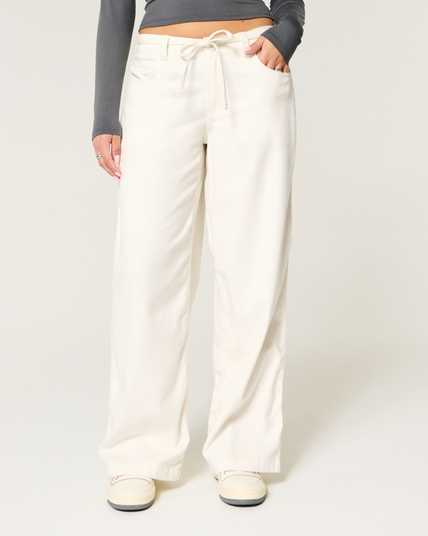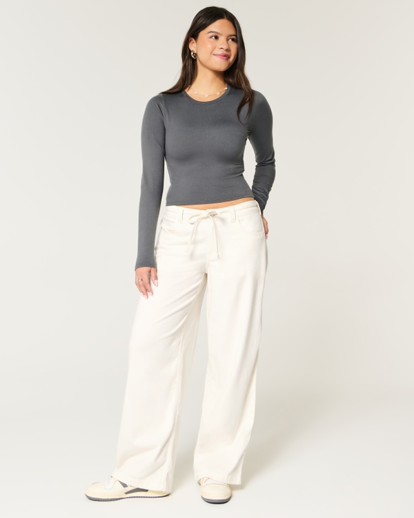 Measure the front of a pair of jeans from the bottom of the crotch seam to the top of the waist band.