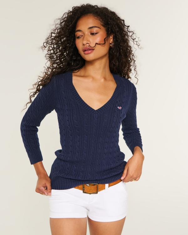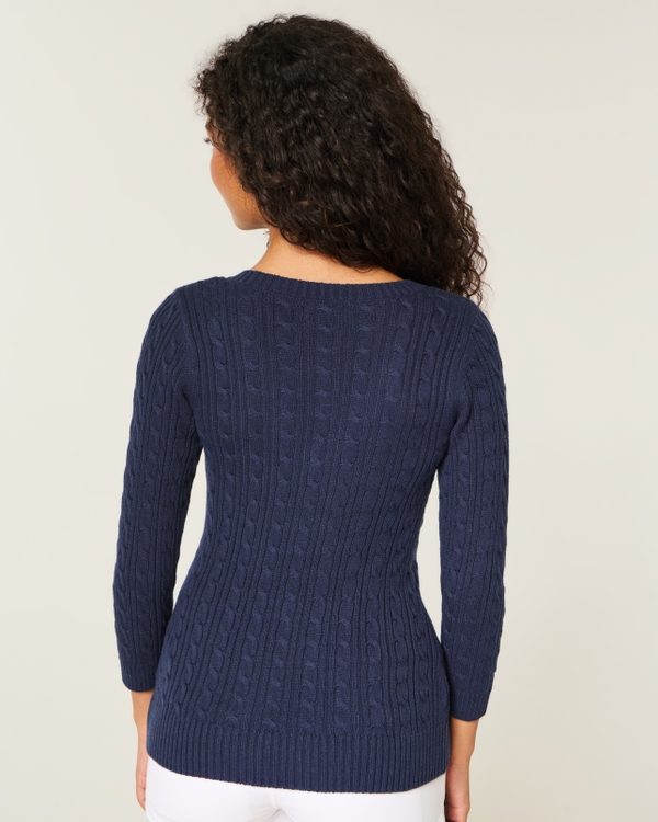 Three-Quarter Sleeve Cable-Knit V-Neck Sweater