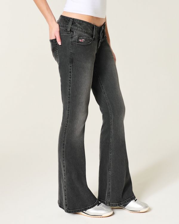 Adjustable Waist Ultra Low-Rise Washed Black Back Buckle Flare Jeans